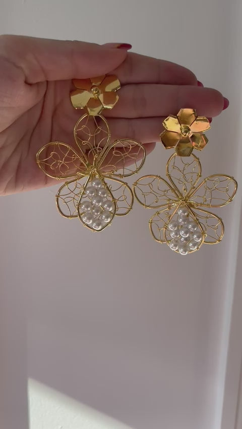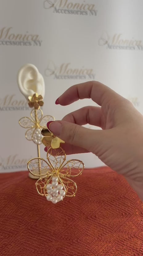 Flor tejida a mano entorchada con perlas, accesorios bañados en oro de 24k.
